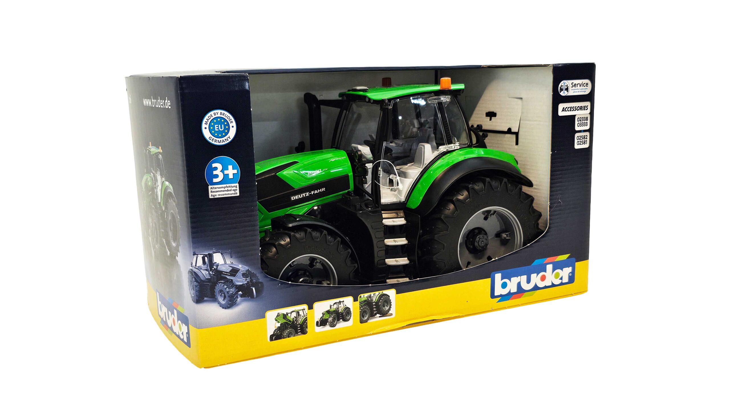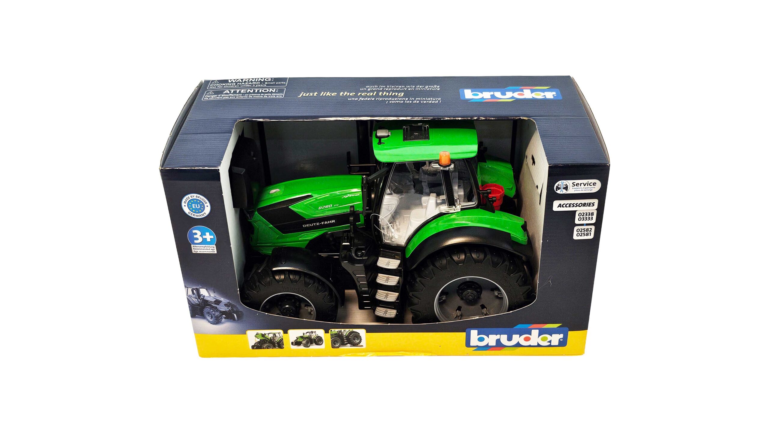 BRUDER-modellen har et fullt innglasset førerhus med dører som kan åpnes. Panseret kan vippes opp slik at motoren blir synlig. Traktoren er enkel å styre takket være bevegelig frontaksel og ekstra styrestang som brukes gjennom taket.